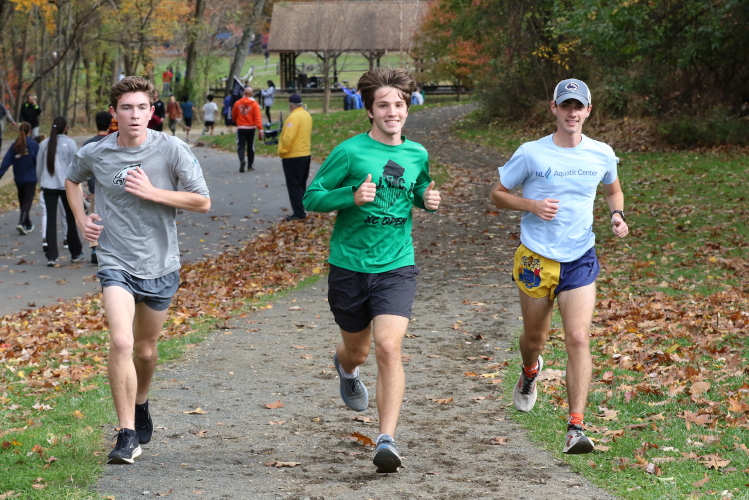On November 25, 2021, several members of the team raced the 6th Annual 5K Marlton Turkey Trot or the Haddon Township Turkey Trot 5K to show-off their beards and spurs! At Marlton, Tommy Bromley, took 2nd behind Alum Ethan Wechler in the race, clocking 16:18! Also in the race were Luke Reistle, 9th in 19:06; Enzo Corona, 13th in 20:26; Myron Paes, 28th in 21:51; and Tyler Newton, 33rd in 22:30. Details at: Marlton 5K. At Medford Lakes, Liam Tindall finished in 16th, clocking 18:28. Details at: Medford Lakes Colony. At Haddon Township, Andrew "Smoke" Free took 11th in the race, clocking 17:35! Details, including a poor video weakened by a chubby official blocking the shot and doing nothing, at: Haddon Twp. Our photographer was at neither race and, apparently, there are no pictures from Marlton, but here is the only pic of Smoke as he beats an ersatz Santa to the finish! Again, the race photographer missed his passing . . . S ...mo...o...o...o...k! (Videos available from all races!)