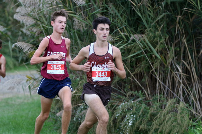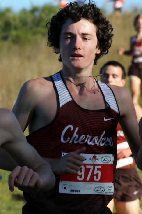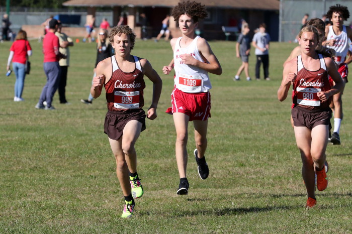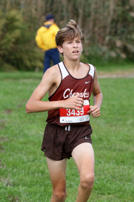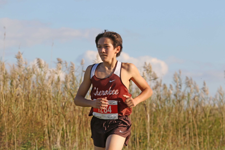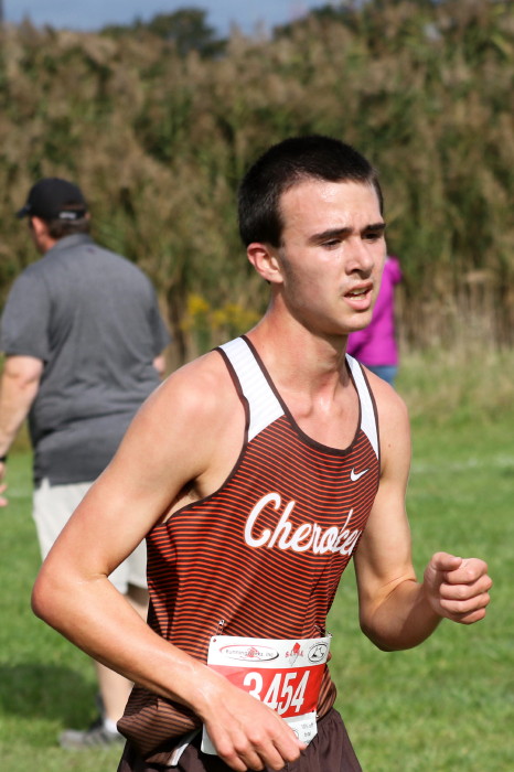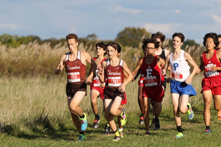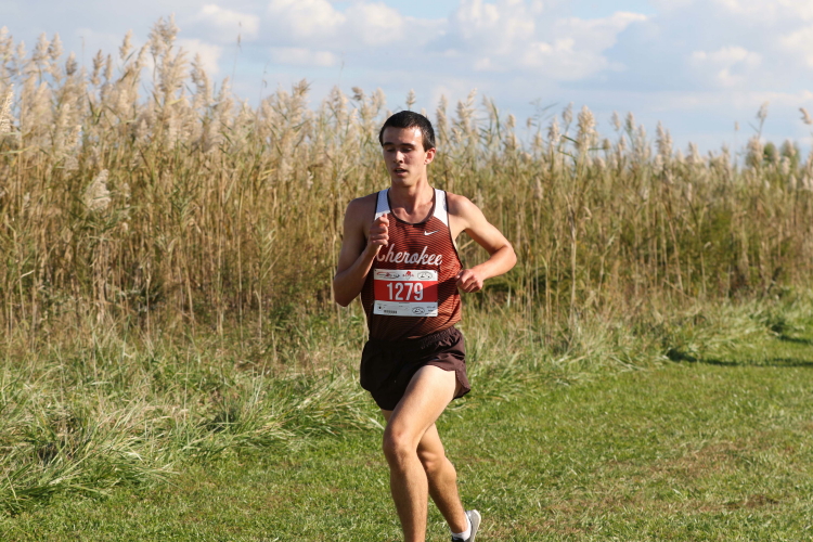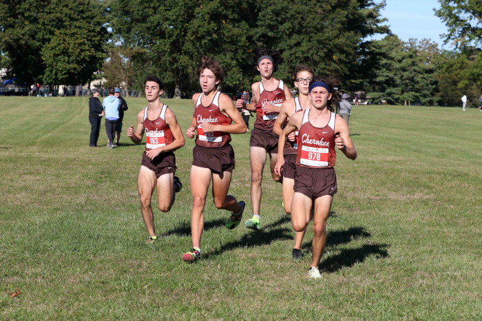 "The Junior Varsity squad was first and they absolutely devastated the field, taking the first 9 spots and 12 of the first 16! I highlighted Junior Varsity because this was a really good Varsity team and, if they were in the championship race, they would have finished a close 3rd to Shawnee! Enzo Corona, Dom Pileri, Silas Matteson, Tate Midora and freshman, Sean Sooy all ran between 17:14 and 17:54 to take the first six spots! Also coming in before anyone from another team were Rory Carroll, Luke Reistle and freshman, Gavin Danielewicz in 7th, 8th and 9th! Behind that group, the other members of the Cherokee team all ran well! Everyone who ran the meet last year improved their times this year! Some, like Sam Wright and Josh Lowery, by almost three minutes!