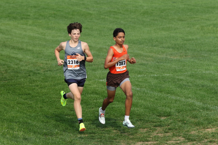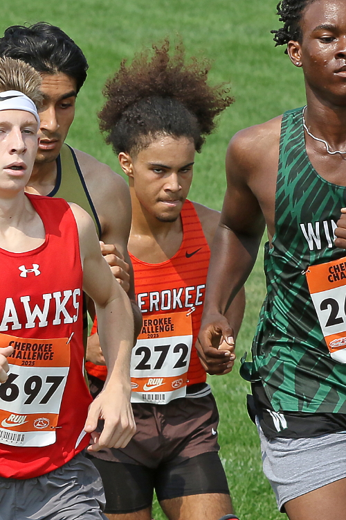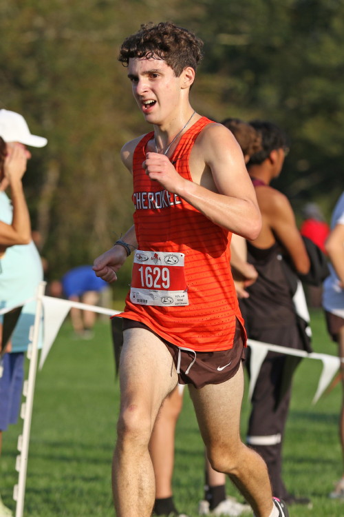 "All five of our Freshmen - Hamza Salahuddin, Colton Harbold, JJ Duncan, Ryan Niederberger and Dawson Talbot - competed with their competition going off at 10:00 AM. Hamza moved up with the leaders from the start and, by the 800 meter mark, was running side-by-side with another athlete at the front. Coming out of the woods and up the Cherokee Challenge Hill, Hamza opened up a lead. However, another runner came up to challenge him and even took the lead heading into the final portion of the course. To his credit, Hamza kept the leader in range and then used a strong kick to move to the lead just before the finish line to take the victory in his first race for Cherokee! The coaches selected Hamza as Athlete of the Meet for the poise he showed in handling the challenge he faced, late in the race, to get the win! Colton also had a strong finish, moving up from 23rd, with 800 to go, to take eighteenth! JJ ran very well to finish in 57th in the field of 282 runners, while Ryan and Dawson finished in 129th and 156th respectively!