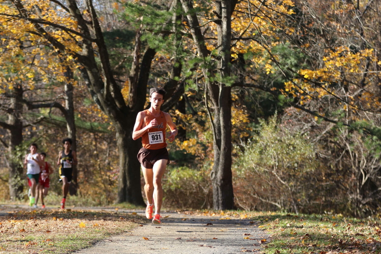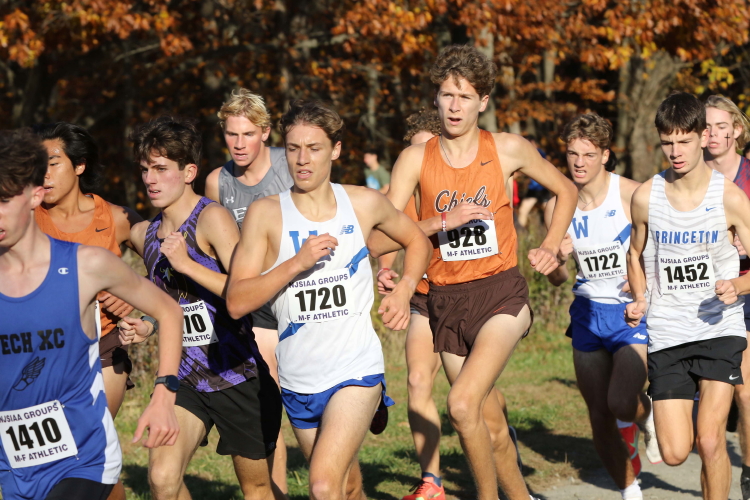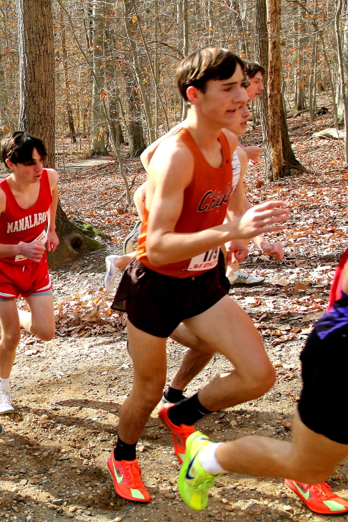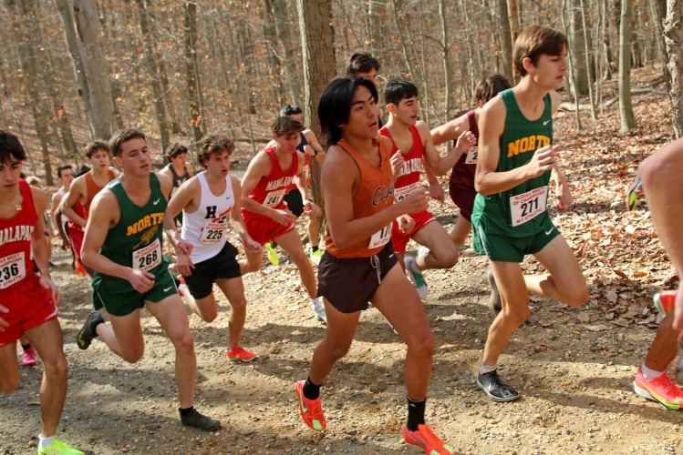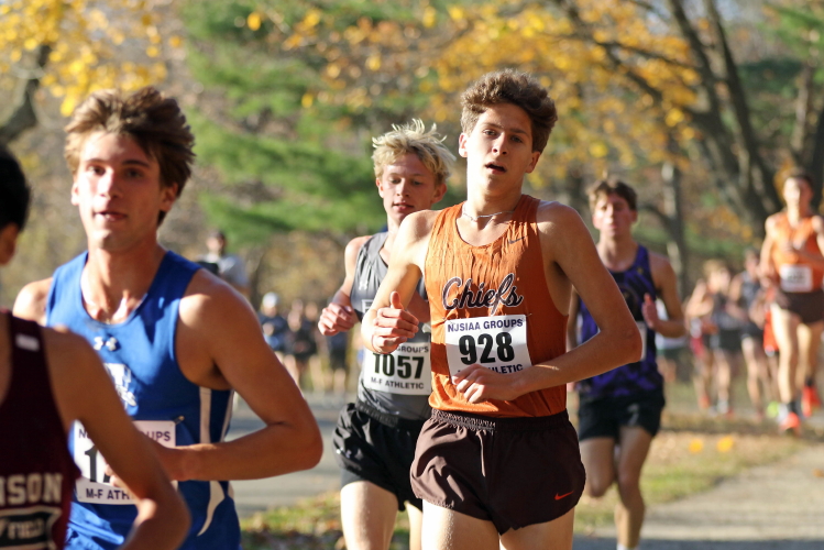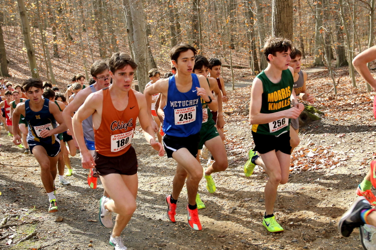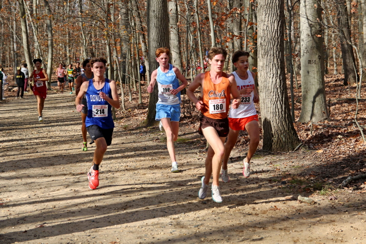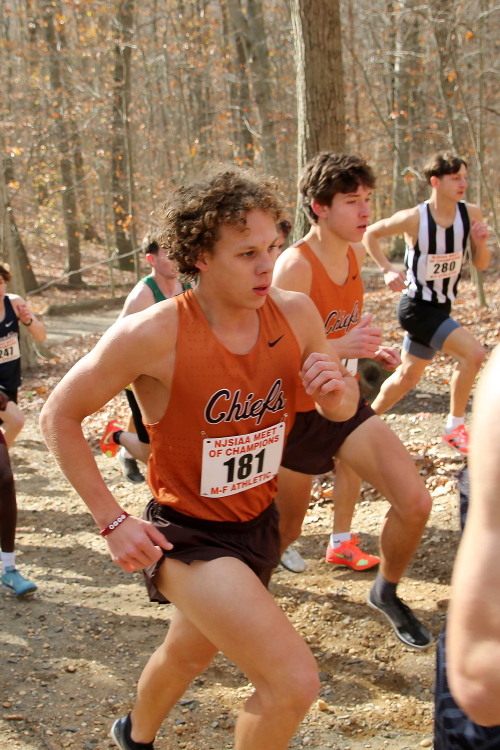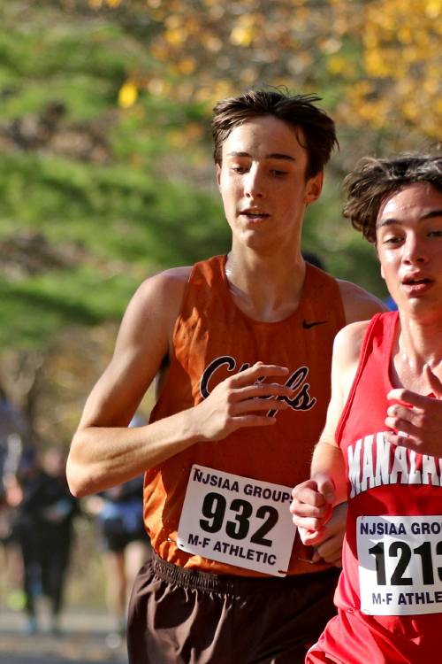"At the mile mark, it was hard to know where we stood. What was clear, however, was that usual third man, Sean Sooy, was not up where he would normally be. He was our sixth man. We had to hope he would move up as the race progressed. Jack Tindall was running in third, right behind the individual favorite, Clay Stevens from Manalapan and North 1 Sectional champ, Michael McGinty of Hackensack. He was in good position but looked as though he was hurting a little. Ben Realley was next in about 7th or 8th and, behind him, Max Harada, Gavin Danielewicz, Leo Vyvyan, Sean and Dom Pileri, all followed within 6 seconds of each other.