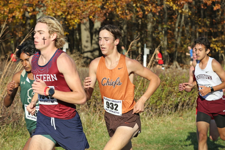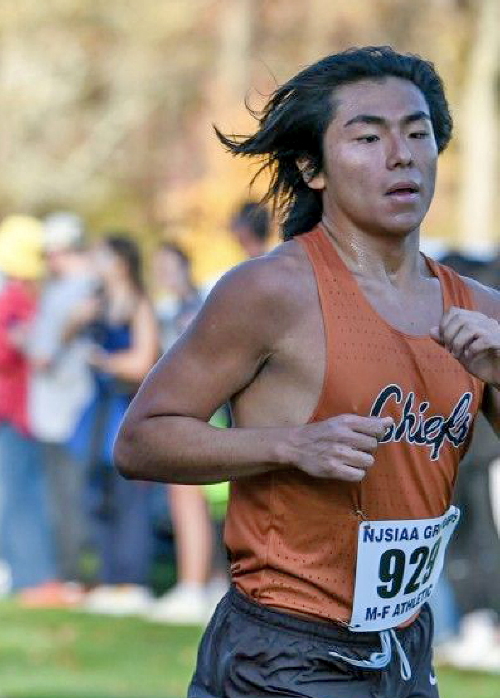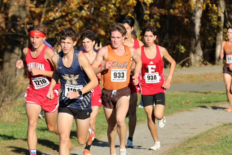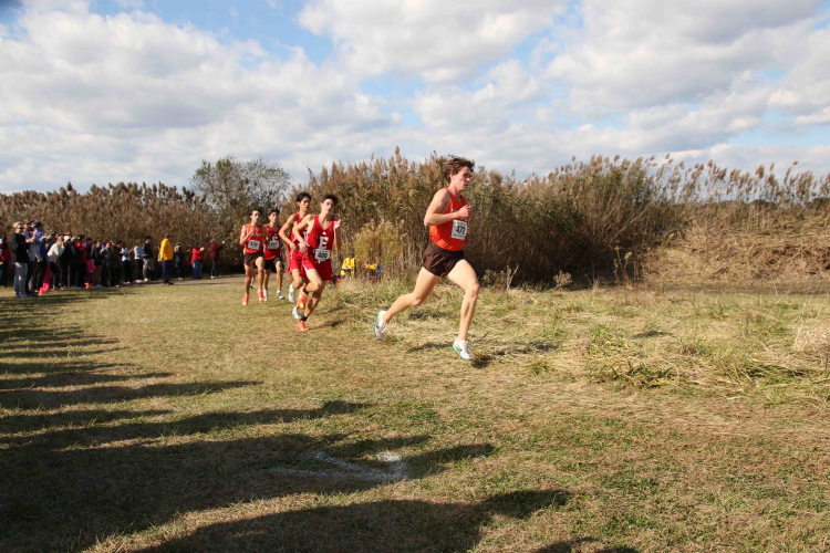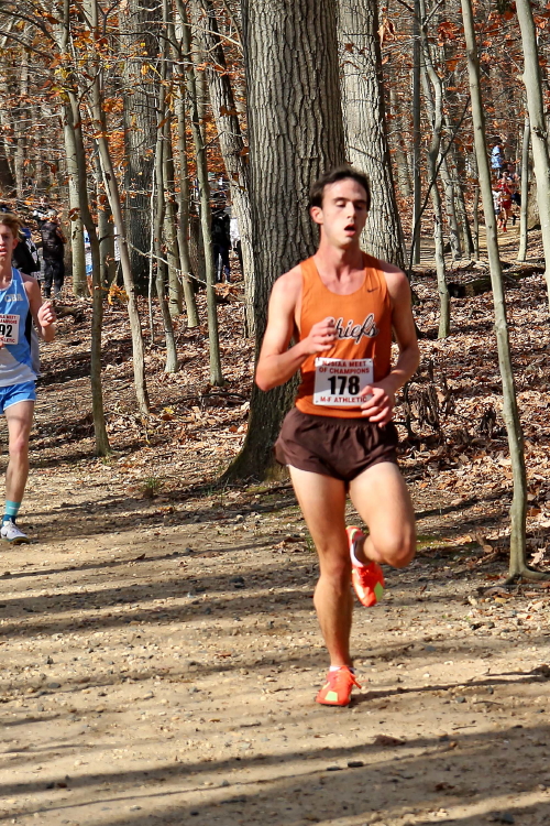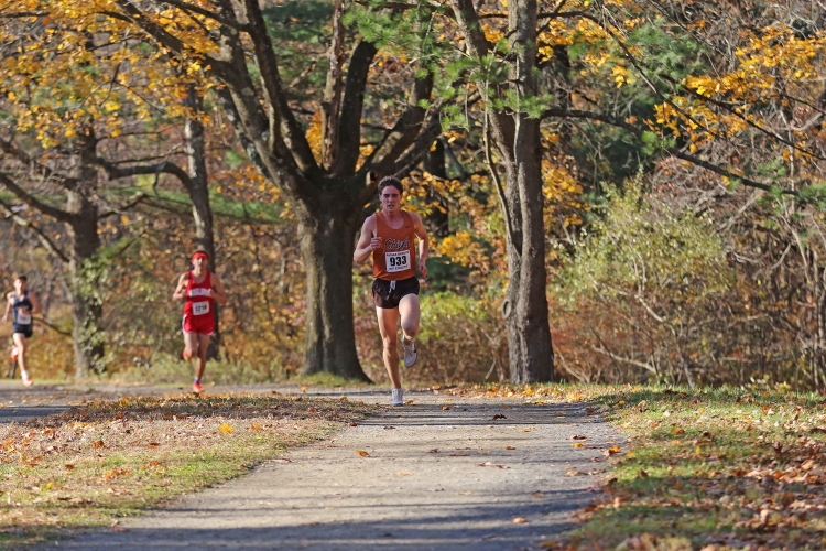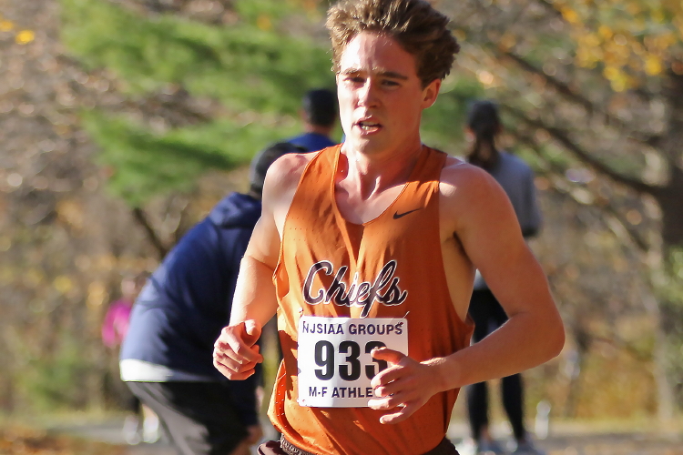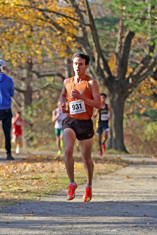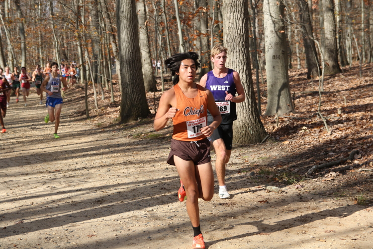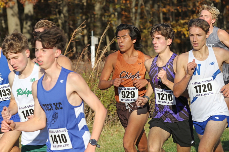 "At the mile mark, it was hard to know where we stood. What was clear, however, was that usual third man, Sean Sooy, was not up where he would normally be. He was our sixth man. We had to hope he would move up as the race progressed. Jack Tindall was running in third, right behind the individual favorite, Clay Stevens from Manalapan and North 1 Sectional champ, Michael McGinty of Hackensack. He was in good position but looked as though he was hurting a little. Ben Realley was next in about 7th or 8th and, behind him, Max Harada, Gavin Danielewicz, Leo Vyvyan, Sean and Dom Pileri, all followed within 6 seconds of each other.