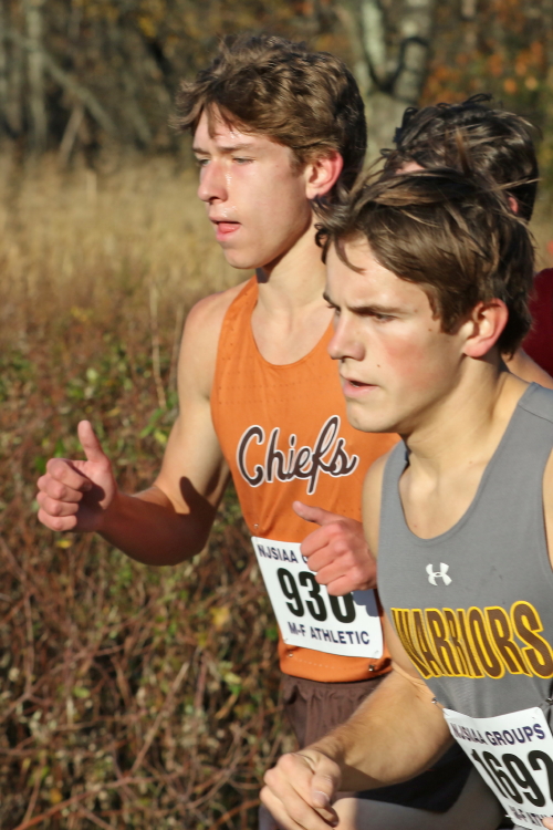 Here are a few of our photographer's pictures, and they and the rest of his -- and the MileSplit guys' work -- are posted at our Google address! (Apologies to Leo whom I missed going and coming! Fortunately, MileSplit's Tom Smith caught him at the finish!)