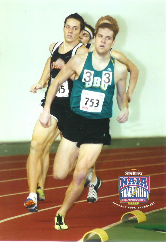 Alum Dave Sitzer ('00) of Oklahoma Baptist University is coming back from ankle surgery in August and he is eager to again make his mark on the national scene. Back on January 23, 2004, he participated in the Razonback Invitational at the University of Arkansas, Fayetteville, where he ran a 3:02 split in the 1200 leg of the Distance Medley, helping his team take 4th in the event. Then on February 14, 2004, at the Adidas Classic in Lincoln, Nebraska, he ran 1:53.46 in the 800, taking 4th! That time is the second-best qualifying time for the up-coming NAIA Championships in March! Click on the links for full results at the Razonback Invitational, and at the Adidas Classic