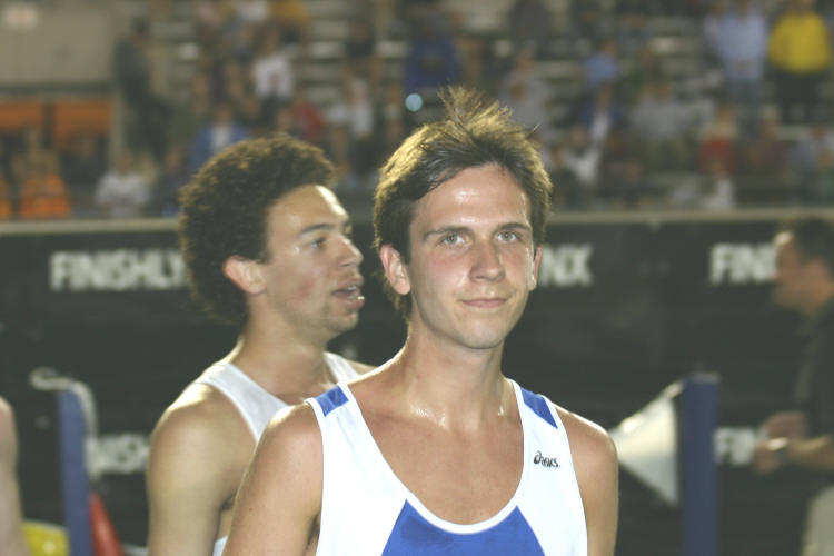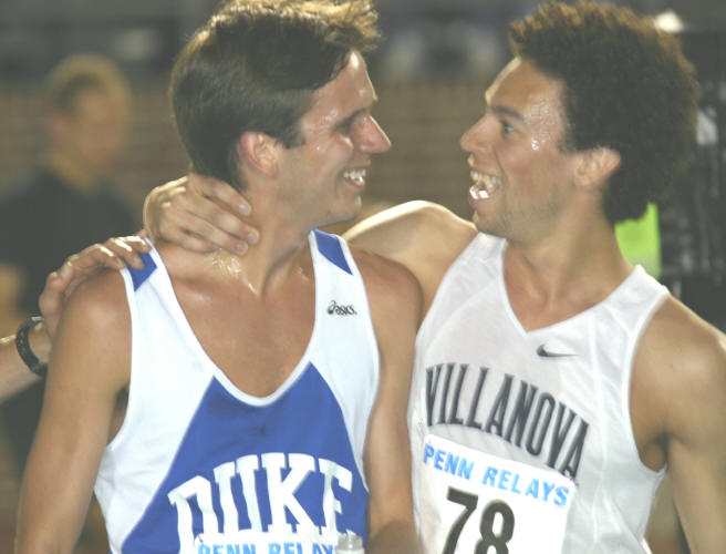 In the third head-to-head Battle of the Alums, Marc Pelerin ('02) of Villanova and Keith Kreiger ('03) of Duke, the victory went to Marc, giving him a 2 - 1 margin! Running in the Men's 5K Run at the Penn Relays on Thursday, April 22nd, Marc and Keith ran aggressively through the first half of the race but Keith fell off the pace in the second half. Marc looked very confident in the lead group throughout, taking the front at various times during the race. Perhaps a bit prematurely, he bolted for the finish line with about 300m to go, but slowed in the last 100m and allowed an opponent to overtake him. Marc finished 2nd with a PR of 14.20.9 (mile splits: 4:33; 4:39; 4:35); Keith finished 14th in 14:40.3.