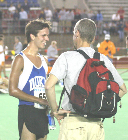 On Saturday at the Penn Relays, Duke was unable to field its usual 4 X 800 squad for the College Men's race in the afternoon. Having no other option, the coach called on Freshman Alum Keith Krieger ('03) to fill-in as anchor! Keith's high school record in the 800 was around 2:03 and there was no reason to think that he could improve on that time at Penn! To make matters worse, the Duke team passed the baton to Keith in 1st place! Yikes! Keith fought bravely but he ended up falling to 10th place in the race, running a 2:04. Full Penn Relays results can be found at: Penn Athletics