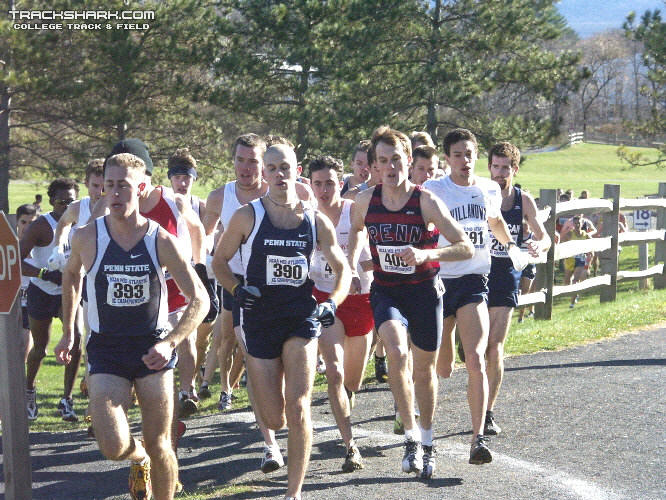 Alum Marc Pelerin ('02) of Villanova University competed in the NCAA Mid-Atlantic XC Regional on the Blue-White Golf Course at Penn State University, State College, PA. In the 10K race with 23 teams competing, the Villanova team took 5th place, while Marc finished 2nd on the team, 17th overall, in 31:08. Full results at: NCAA Sports. The following pictures were taken by JoTSPhoto and displayed on TrackShark.com.