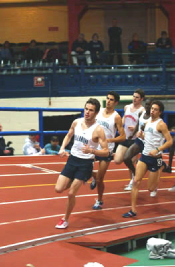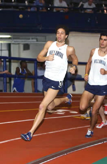 -- On January 14, 2005, two of Cherokee's Alums competed in the NYU Invitational at the New York City Armory. Alum Marc Pelerin ('02) of Villanova University posted a 4:13.40 in the mile, finishing 3rd on the Villanova team and 4th overall; while Alum Alex Whirledge ('04) of Widener University was timed in 51:23, for 15th place in the 400m. Full results at: Armory Track. The following pictures of Marc were taken by Mary DiBiase Blaich of Winged Foot Fotos and displayed on RunNova.