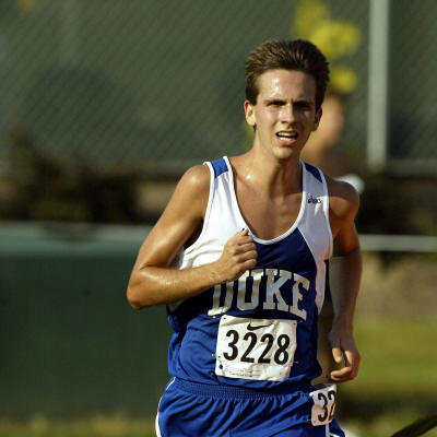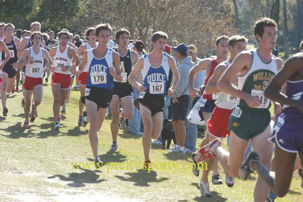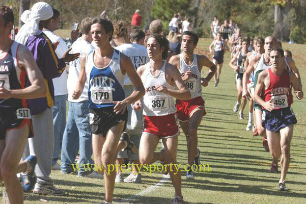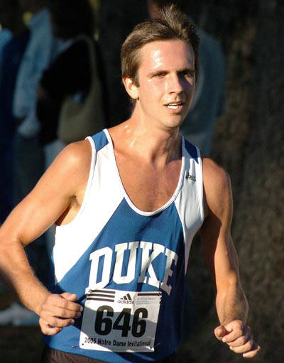 -- On September 30, 2005, Alum Keith Krieger ('03) of Duke University competed against what had to be the strongest regular-season field in the nation at the Notre Dame Cross Country Invitational in South Bend, Indiana. Keith SMASHED his previous PR by over 30 seconds, finishing 30th overall and 1st on his team, in an incredible 24:30! Wow! Complete results at: ND Sports. The first two pictures are file photos from Duke's website. The first is Keith's team mugshot; the second is a competition shot probably from Great American, 2003. The third picture is actually from the race, by Chris Fox at Mensracing.com: New York Roadrunners Club.