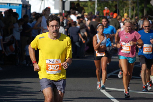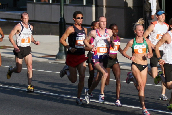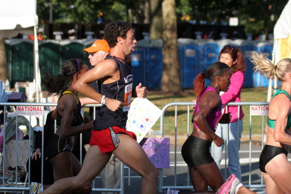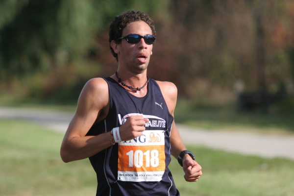 -- On September 19, 2010, Alum Marc Pelerin '02, now working as an Assistant Coach at Cherokee High School, joined over 18,000 other runners at the ING Rock and Roll Philadelphia Half-Marathon through downtown Philadelphia and along the Kelly (East) and King (West) Drives. Marc began the race pacing himself alongside several world-class female marathoners but, sometime after the mid-point, he began to lose contact with this group. He flew through the first mile going under 5 minutes; then the 5K in 15:41 (5:03); 10K in 31:46 (5:07); 10 Miles in 52:13 (5:14); Finish in 1:10.19 (5:22), 48th overall. Yikes! Further details at: ING Half-Marathon. Marc's bib number was 1018. The pictures first show Marc at about 1 and 1/2 miles into the race, then at about 5 and a 1/2 miles, and then about 1000m from the finish.
