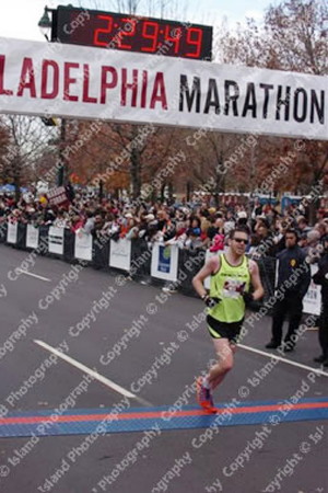 -- On November 19, 2011, Alum Joe Halin '00, of the Moorestown Running Company, ran the Philadelphia Marathon through the streets of the city. Joe set a strong "national class" pace throughout, taking 20th out of 10,228, finishing in 2:29.49! Yikes! Details include almost clockwork pacing through the first 30K: 5:42.8 overall, with the 10K in 35.22 (5:42), the Half-Marathon in 1:14.28 (5:41), and the 30K in 1:46.00 (5:41)! His pace dropped a tad on that last 12K segment (5:47?) but sub-2:30 is an incredible achievement! GO JOE! Interestingly, we just heard a question proportedly asked by Frank Shorter in 1970 that Joe might appreciate: "Why couldn't Pheiddipedes have died at 20 miles?" "Sample" pictures below . . . we should have sent Stan Applegate! Details at Active Results.