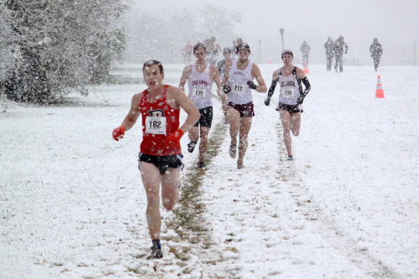 -- On October 29, 2011, Alum Chris Applegate '09, of Bucknell University made the trip up to wintry Lehigh University for the Patriot League Cross Country Championships. Chris navigated the snow-covered course in 27:22 (5:31 pace and 36 seconds faster than his race there a month ago) finishing 59th overall and 10th on his team. The team finished 5th in the 8-team conference but only one of their top seven is a Senior, with four Freshmen, so it looks good for the future. Proud father, Stan Applegate, sent these pictures to demonstrate that the phrase ". . . navigated the snow-covered course . . ." doesn't quite capture the sublime experience! You decide! Results at: Navy Sports.