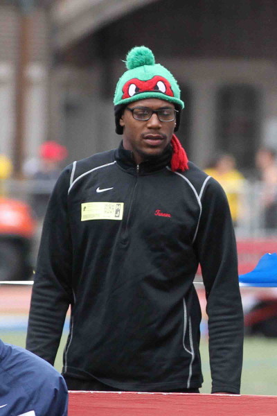-- On April 27, 2012, Alums Justin Turner '09, of Gwynedd-Mercy College, and Ed Kramer '10, of Monmouth University, competed against each other on a windy morning at the Penn Relays in the "Eastern College High Jump." Justin tied for 7th after clearing 2.00m (6' 6.75") while Ed had to settle for a tie for 17th after he cleared only 1.96m (6' 5"). The results show Ed cleared the opening height of 1.96m on his 2nd try but failed to clear 2.00m; Justin cleared both the opening height and 2.00m on his first attempts but failed to clear the next height. Details at: Penn Relays On Line, and more specifically, Event 702 at Penn Relays On Line, Event 702. Our photographer was on-site while our two Alums were warming up and caught the following pictures (OK, don't ask about Justin's cap):