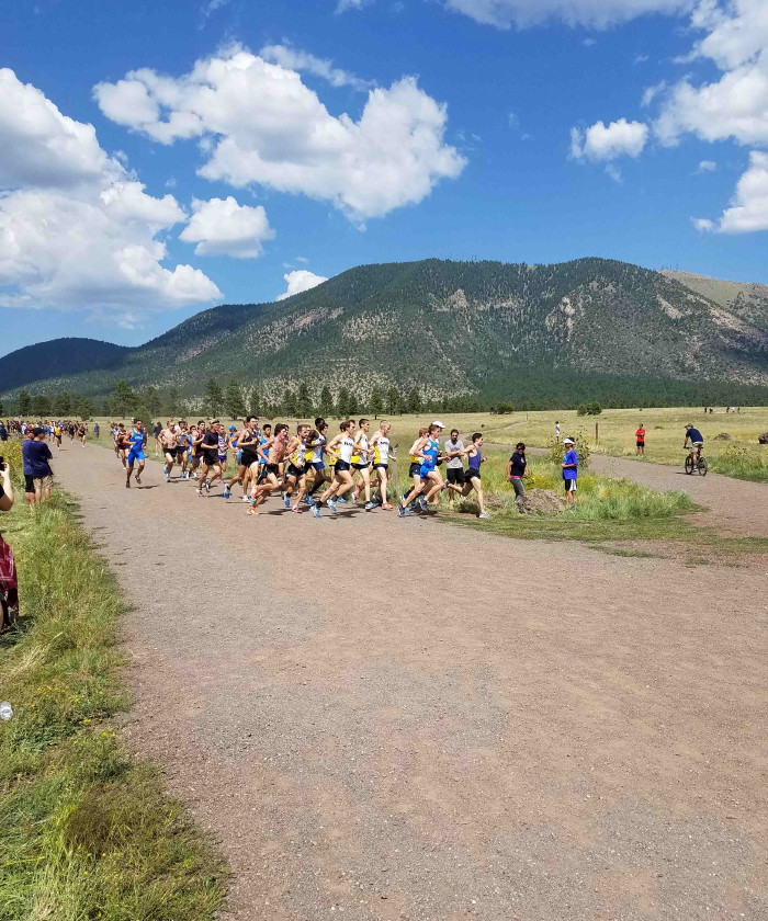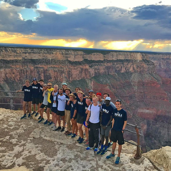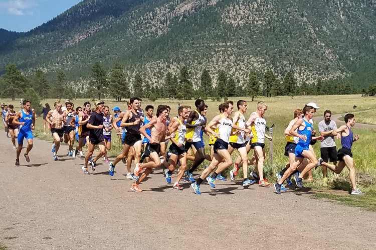 -- On September 2, 2017, Alum Jack Shea '17 of Northern Arizona University opened his college racing career at home in the 4.5 Mile Open Race of the George Kyte Classic at Flagstaff's Buffalo Park. National Champion NAU swept both the Varsity and Open competition, suggesting they're ready for the up-coming season! Jack finished in a 3 - 4 - 5 pack (that included Elliot Gindi, NJ's state champion last year), clocking 23:59.3 (5:20 pace). Race results at: Direct Athletics. The NAU site also reported on the race including a brief comment by Ass't Coach Jarrad Cornfield on our New Jersey boys: "Some of the freshman guys really stood out, Elliot Gindi and Jack Shea had strong races today." Our photographer was unavailable for the meet but he acquired this race picture from NAU that clearly shows Jack with the race leaders! The second picture, showing the team at the Grand Canyon, appeared on the NAU XC Tritter account. Setting not quite as spectacular as Camp Canadensis but it's OK. GO JACK!