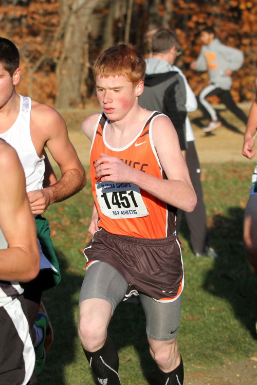 As it turned out, the guys proved that they could, indeed, race with the best but the results were somewhat mixed. They finished 3rd behind Cherry Hill East and Kingsway Regional and qualified the team for the State Group Championships but the overall team performance was slightly disappointing: indeed, had the team run races similar to those run in the previous Olympic Conference Meet, Cherokee would have easily finished ahead of Kingsway. But there were still some good individual performances. Anthony Marrazzo and Steve Gravlin cut significant time off of their previous best times on the Delsea course (Anthony dropped 61 seconds, Steve dropped 56 seconds)! In addition, both Nick Falk and Kaleb Burch improved their Delsea bests by 9 seconds (and Kaleb did that despite hitting a post and taking a fall in the last mile). Most impressive, however, was the aggressive racing of senior, Nick Maccariella, who not only knocked 44 seconds off of his Delsea time but also improved by 21 seconds over the excellent race he ran at the Olympic Conference Meet! Given this big improvement and the focus and determination he showed throughout the race, Nick earned Runner of the Meet honors. GO LIKE THAT ANYTIME, NICK!