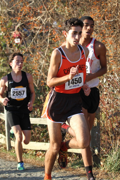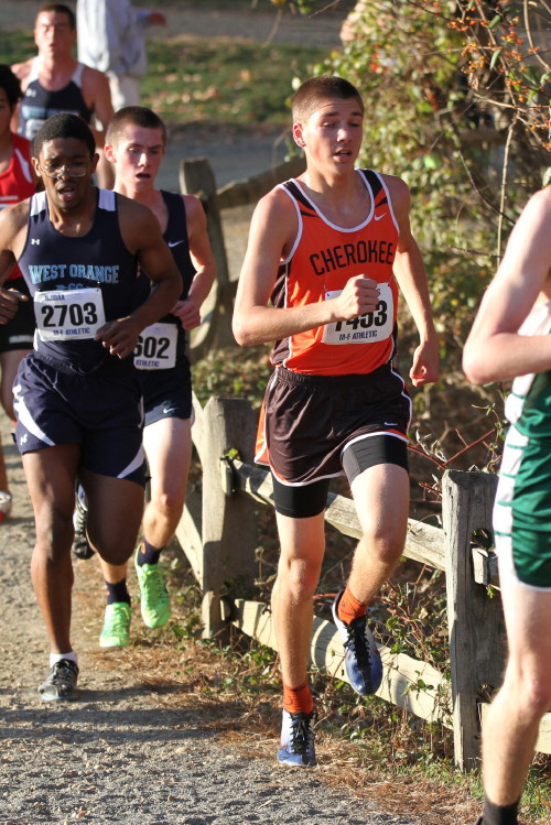 On November 16, 2013, Cherokee's "Varsity 7" toed the line at the State Group IV Championships with high hopes but some very practical expectations! Doing the math from the previous Sectional Championships around the state, Cherokee was seeded 14th in the race but that didn't stop some individuals from running impressive times! Leading the way for the team, as he has all year, was senior Captain, Kaleb Burch who finished 24th in the race! His time of 16:47 was a PR on the course by 27 seconds and made him the 16th fastest Cherokee runner on the championship course since the state first moved the meet to Holmdel 36 years ago, and made him a leader on the Cherokee D Team, Holmdel Park All-Time Team Performances list! Senior, Nick Maccariella, was next for the team, clocking 17:09 and finishing in 53rd! In only his first season of cross country, and the first time he had ever seen the highly-demanding Holmdel course, Nick is now Cherokee's 29th fastest performer on the state championship course! Close behind him was Freshman, Nick Falk whose time of 17:17 put him 39th on the Cherokee Holmdel list and only 2 seconds off of the school's freshman record! Finishing off the scoring for Cherokee were Junior Justin DeTone; Freshman Jack Shea, Sophomore Steve Gravlin, and Senior Anthony Marazzo.