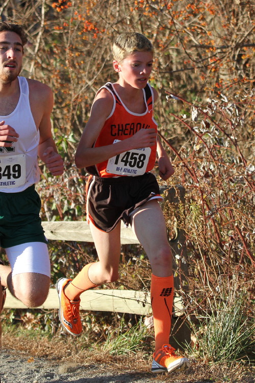 Odds and Ends. (1) Last week, Keleb Burch ran into an "invisible" post on the Delsea course and knocked himself down. That didn't help his overall performance but he persevered and finished in the top-10! This week, Jack Shea, already slowed by the mob of runners, tripped on a root not far into the first woods and hit the ground hard but he was up and running within seconds! (2) Just to give you some idea of how the competition has improved over the years, Keith Krieger set the Cherokee Freshman record of 17:15 at Holmdel in 1999 and he finished 28th. This year, Nick Falk came within 2 seconds of that record and he finished 61st! (3) It was the first time five of Cherokee's "Varsity 7" actually raced the championship course at Holmdel! Welcome to "the bigs" boys! (4) Last year was the first time since 1994 that a Cherokee team failed to qualify for the State Group IV Championship (Shawn Wilson won the race and advanced), and this was the first year since 1994 that Cherokee did not send a team or at least one runner to the Meet of Champions! That said, the new streak begins next year!