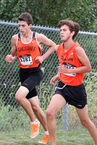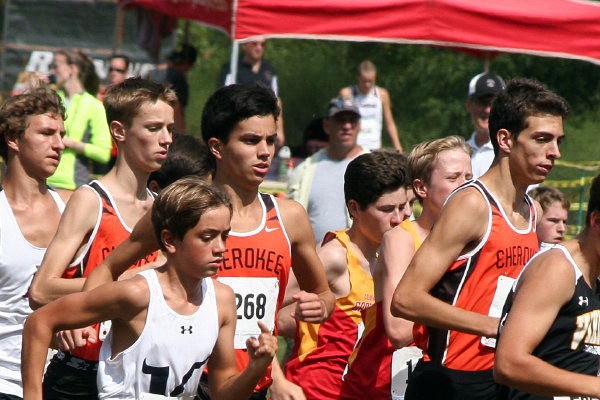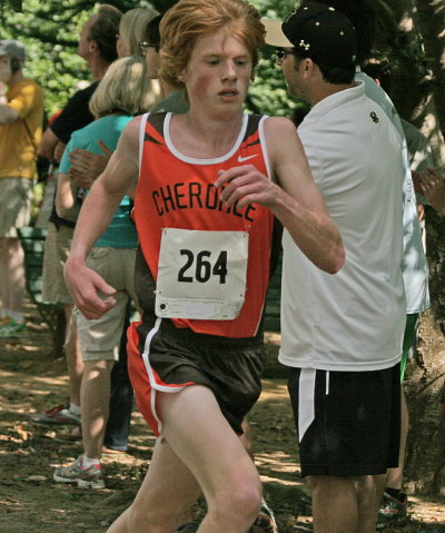 For the Cherokee team, it was a good start for the team and a chance to get an idea of where we are and what we need to do. The team's goals are way down the road in late October and November, but this was a strong beginning! Despite running without two important seniors -- Justin DeTone was sick and Noah Gil was taking the ACTs -- Cherokee put five runners between 10:17 and 10:58 after only having two under 11:00 last year. Nick Falk led the way with his 3rd place finish in the Sophomore race, a 33 second improvement over last year. Jack Shea was right behind him in 6th, with a 34 second improvement, while first year runner, Brendan Falzone snagged a medal taking 30th in the field of 304 runners! Mike Zurzolo also medaled in the Junior race, placing 21st and running faster than our top runner in last year's meet! Steve Gravlin dipped under 11:00 and made the top 50 in a field of 335! Other top juniors for Cherokee were Ty Kurzawa, who dropped his time by 30 seconds from last year, and first year runner, Dave Osterhout, who finished in the top 1/3 of the field in his first cross country race ever!