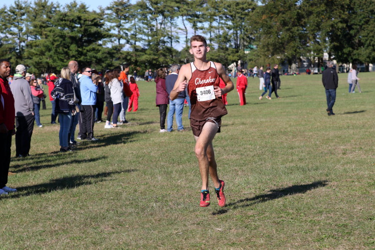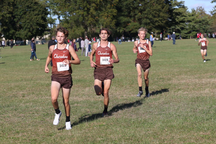 The JV race went first and got things started off in fashion with Cherokee putting eleven athletes in the top twenty-two in a field of 165 runners! Freshman Conor Jacob led the way with a great race to take the individual victory! Conor's time would have placed him 14th in the Varsity race, making him Cherokee's overall 6th man! For running an absolutely perfect race - smart, focused, determined - Conor earned Runner of the Meet honors! GO CONOR!