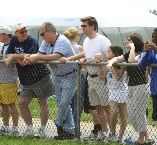 The "real" highlight of the meet, however, came at the end when a team of weightmen challenged others to an "invitational" mile relay. Five Cherokee squads were soon formed and the race began! Quickly but inaccurately dubbed "The Thunder Thighs," the sleek and powerful squad of seniors Mike McHugh, Andrew Medvec, Kevin Cannon and Rich Baker rounded the track in a blistering 4:21.8. Some pointed out that, alone, two years ago, Marc Pelerin ran almost 10 seconds faster over the same distance, while others remarked wistfully that it will be a long time before such a spectacle returns to a high school track! The last pictures below -- though dark because of passing storm clouds -- are of the gallant competitors!
