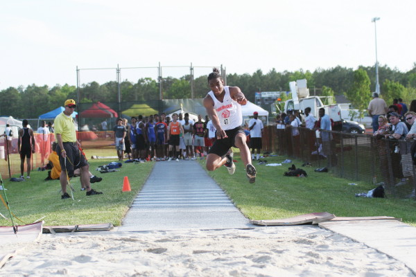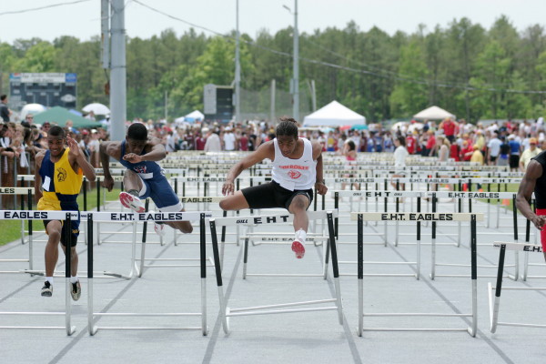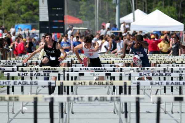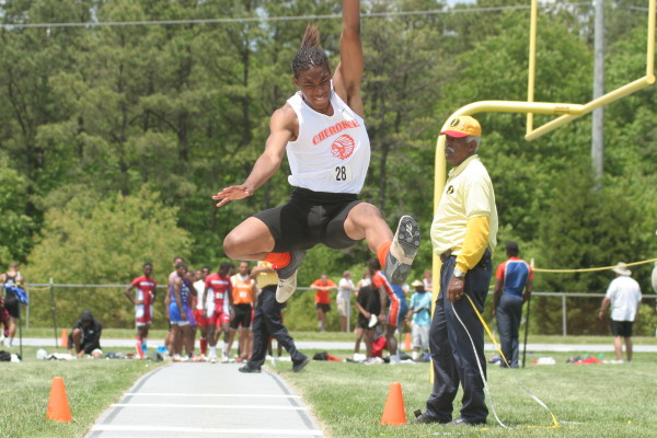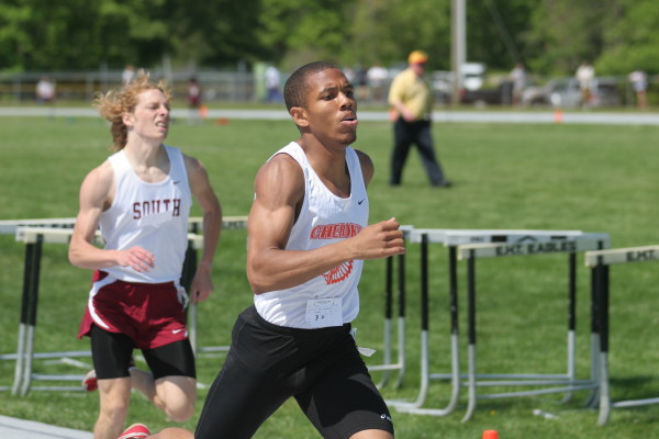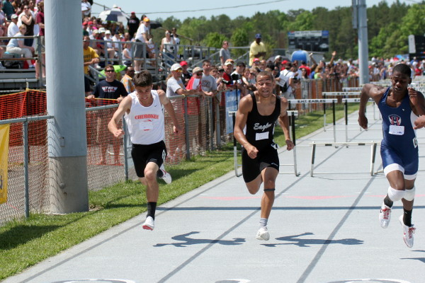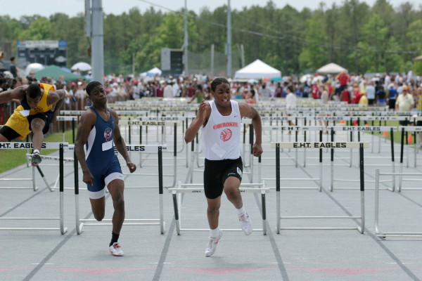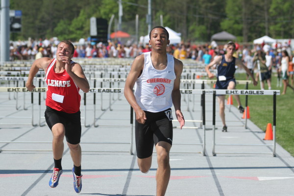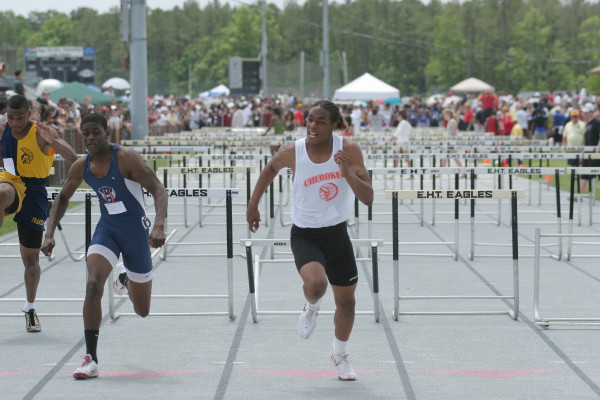 On Saturday, several Cherokee athletes performed very well but only four advanced to the State Groups. All three 110m High Hurdlers ran well in the trials with Major Mobley setting a PR of 14.88 to qualify 2nd for the Finals and Mike Brocco running a FAT PR of 15.42 to also qualify for the Finals! Darren McCluskey also ran well (15.54) but missed qualifying by one place! Mobley then returned in the Finals, finished 2nd in another PR of 14.85, and advanced to the State Groups! Brocco ran even faster in the Finals than he did in the Preliminaries (15.39) but failed to advance to the State Groups!