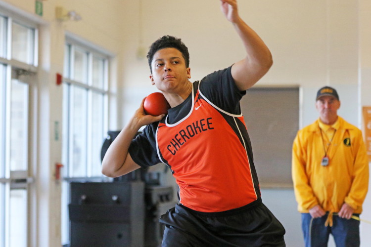 On January 26, 2017, the Cherokee Throws team hosted the Cherokee Throw Down # 2 at the school. This time, the team added a third Shot Put circle, a sophisticated IAAF Certified circle that can be used to host international Shot Put competitions (in case the Russians want to send some athletes to Cherokee's Throw Down #3!) and, even with almost 200 throwers, the meet moved rapidly! Coach McMichael sent the following report!