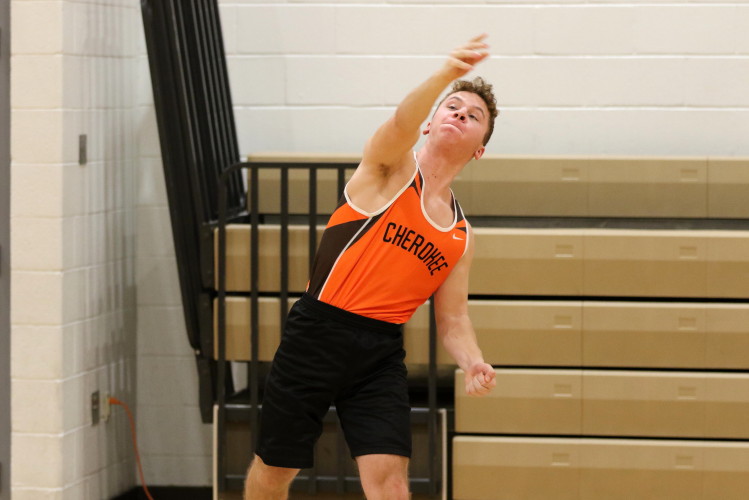 The meet started with the 200m Dash where both guys from Cherokee broke their PRs! Junior Joe Sands ran 26.15 and classmate Becker Elbanna ran 26.08, which was faster than his outdoor PR!