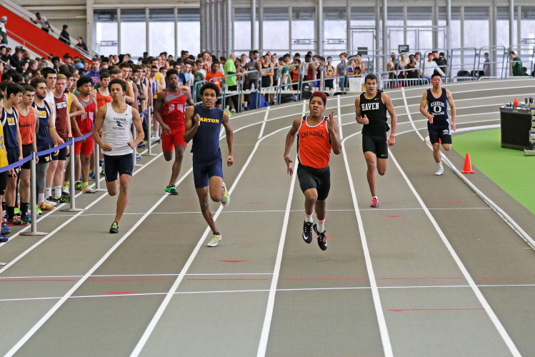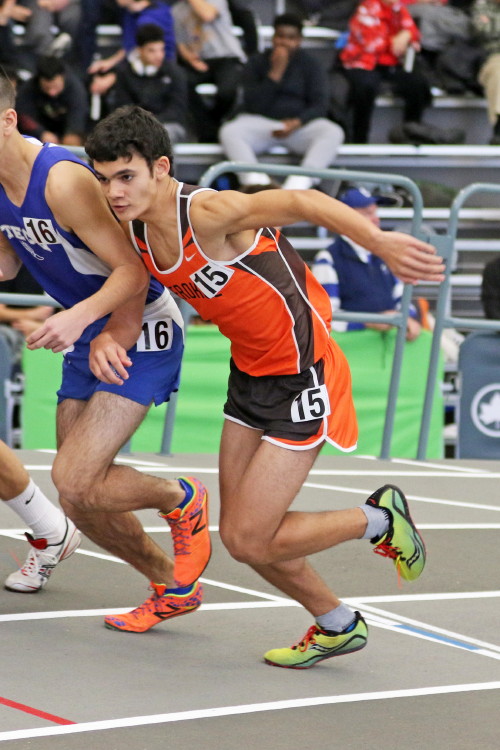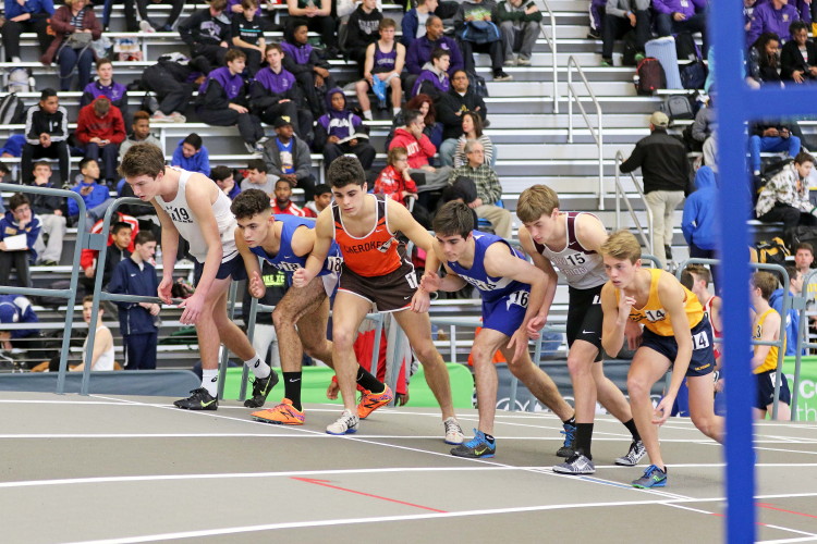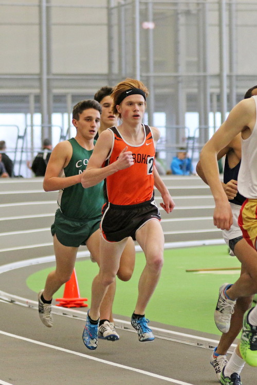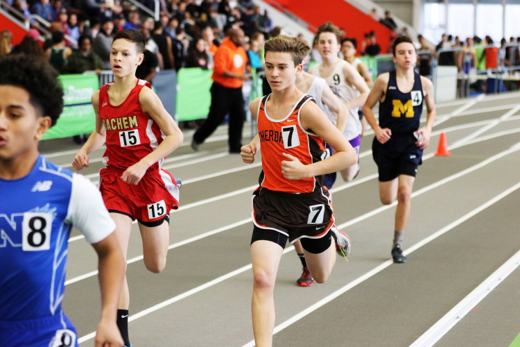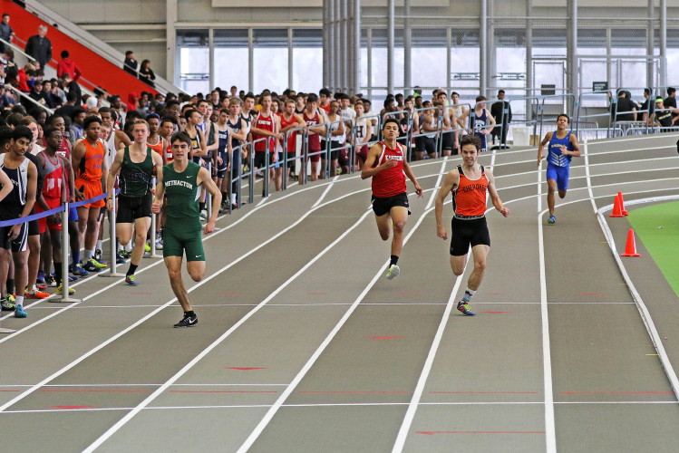 Next on the track was the 1600 Run, which featured senior Brendan Falzone, freshman Ethan Wechsler, and junior Taha Rana. They ran 4:47.64 (10th), 5:05.85 (20th), and 5:11.97 (23rd), respectively.