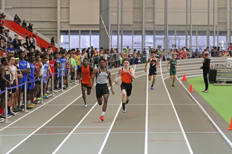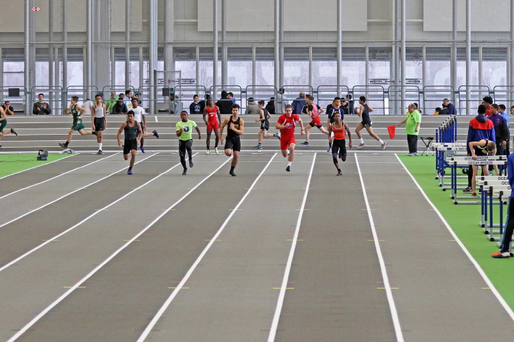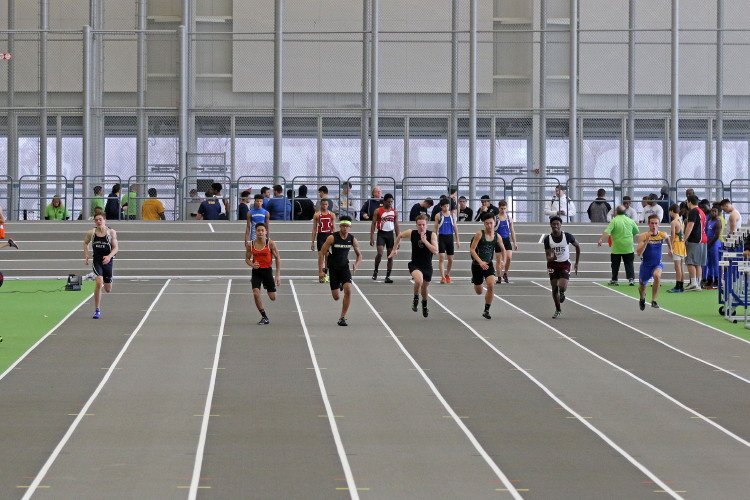 The Ocean Breeze Track and Field Center features a banked track, which the guys took full advantage of in the 200m Dash. The Chiefs had six guys in the 200m Dash and all six set new PR's! Kevin Milligan led the way in the varsity heats of the 200m Dash by running 23.74. This is his fastest time indoors or out. Matt Powell was next in 24.29, and CJ Lee set a new all-time best (indoors or out) of 24.51. Later, classmates Will Delendik, Andrew Elsey, and Tray Cabbagestalk competed in the Sophomore 200m Dash. Will's time of 23.56 beat his previous PR's, indoors and out! The top 6 finishers from 12 heats qualified for a Sophomore 200m Dash Final. Incredibly, Will finished in 7th place! In a heartbreaker akin to Tray's in the 55m Dash, Will missed the final by 0.08 seconds. Andrew Elsey clocked 24.66 and Tray ran 24.83.