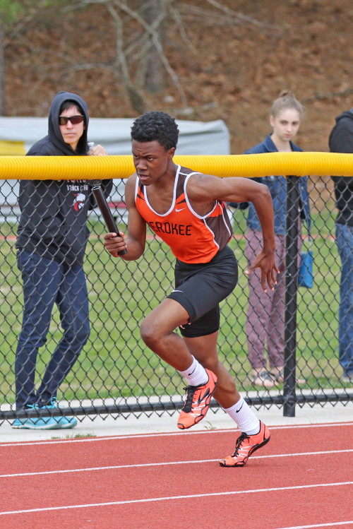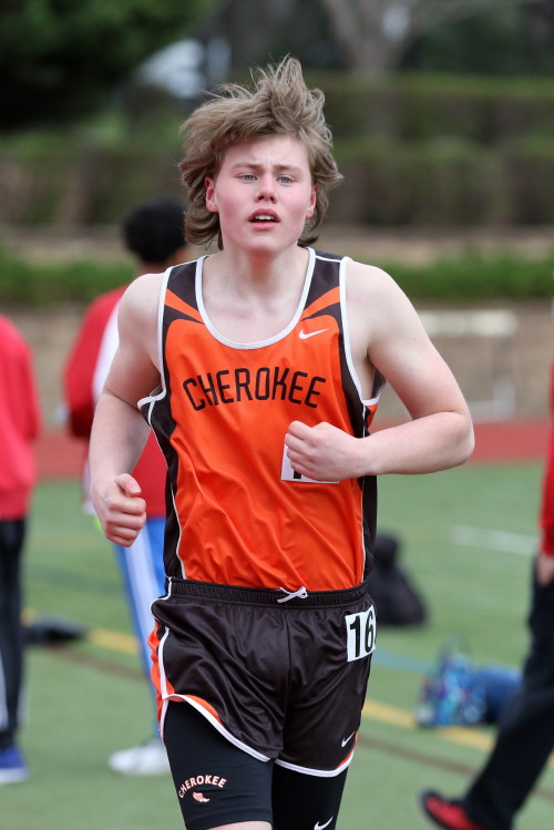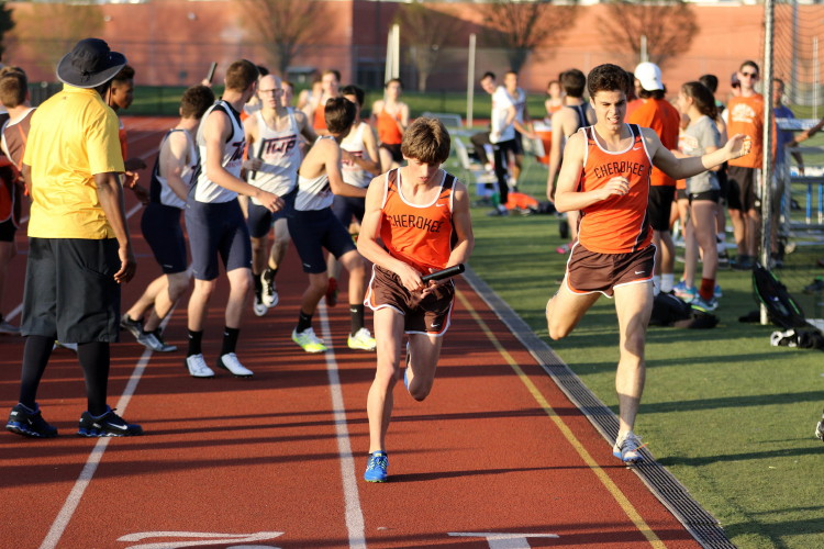 The Sprint squad had a rough time but several upperclassman and several newcomers helped to keep the team in the running! In his first race as a Chief, Freshman Jamar Dimanche ran 11.4 in the 100m to take 3rd, and Tra Cabbagestalk ran 11.6, with Andrew Elsey, CJ Lee and Freshman EJ Bard following in 11.7! In the 200m, the Chiefs were led by Junior Captain Kevin Milligan whose 23.4 earned him 2nd place! Close on his heels was Jamar Dimanche who ran 24.2 and placed 3rd!. Jamar's first two races on the Cherokee track team earned valuable points for the team, and everyone is excited to see what he will do by the end of the season! The other runners in the varsity heat were CJ Lee (24.0), EJ Bard (24.6), and Matt Powell (24.8). Finally, in an exciting 4 X 400m Relay, Tyler Ortiz led off with a 54.4 and handed off to Freshman Tyler Jackson who showed the poise of a seasoned veteran holding off his competitor while on the outside of lane one on the first turn, and then blasting along the back stretch! Although Tyler gave up the lead on the homestretch, an expertly executed handoff to Joe Sands put the team back in first place! Joe ran a 53.7 and handed off to Kevin Milligan who anchored the relay in 51.1 to win the event in 3:32.3!