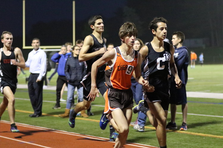 In the second event of the evening, the 1600m Run, Senior Brendan Falzone, finished his career in style! After setting an 800m PR at Sectionals on Saturday, Brendan came back with a 1600m PR in his last high school race! Cherokee's top finisher was Freshman, Chris Spisak, who, despite not having his best day, still managed to run his 3rd fastest time and now has 3 of the 6 fastest times ever run by a Cherokee freshman! Other PR's were set by David Jackson, Mike Iannotta, Jon Conn, Matt Smith, Jake Hyzy, Mike Gavio, Matt Morgan, Matt Campbell, Aathi Anandan and Ben Rosenberg. Matt Morgan's was especially notable as he broke 5 minutes for the first time, while both Jon Conn and Matt Smith broke the 4:50 barrier!