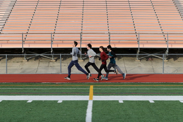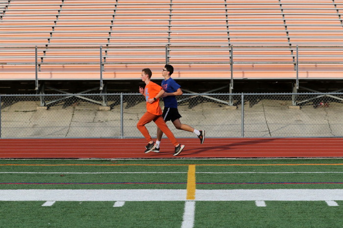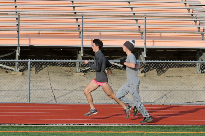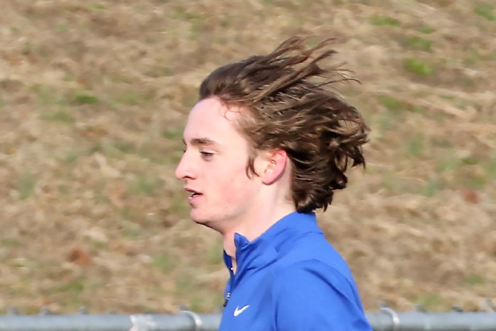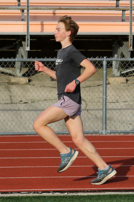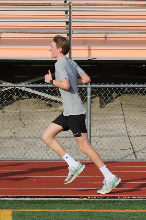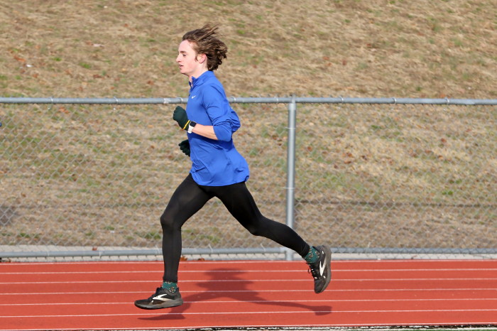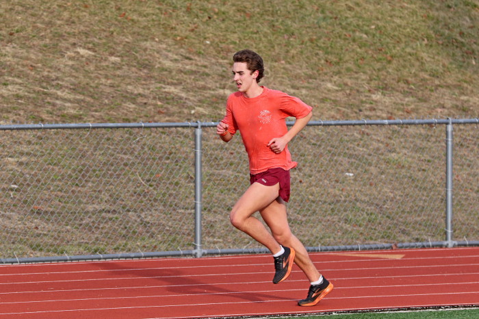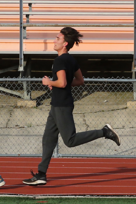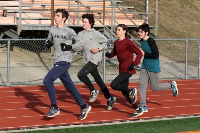 On February 2nd, 2023, the team -- mostly distance guys -- had an nice-weather opportunity to do some work on the track and our photographer took advamtage of the same! High 40s, which isn't so odd during this unusually warm winter in South Jersey, light breeze AND, very unusual, sunshine! Our photorapher favors sun at his back and runners looking ahead, with relaxed hands and shoulders, chest out with no slouching, driving knees and a quiet footfall. He also likes empty stands in the backround and, incredibly, that's what he got! No one showed to watch the guys and girls in action! Apology needed: except for one, the Sprinters are missing here because they were in a shaded corner of the track and our photographer stayed with the Sunshine Boys!