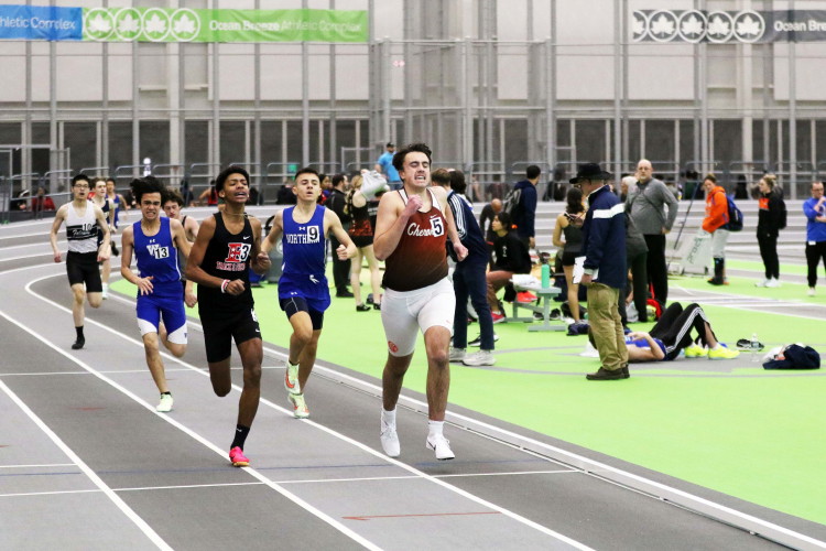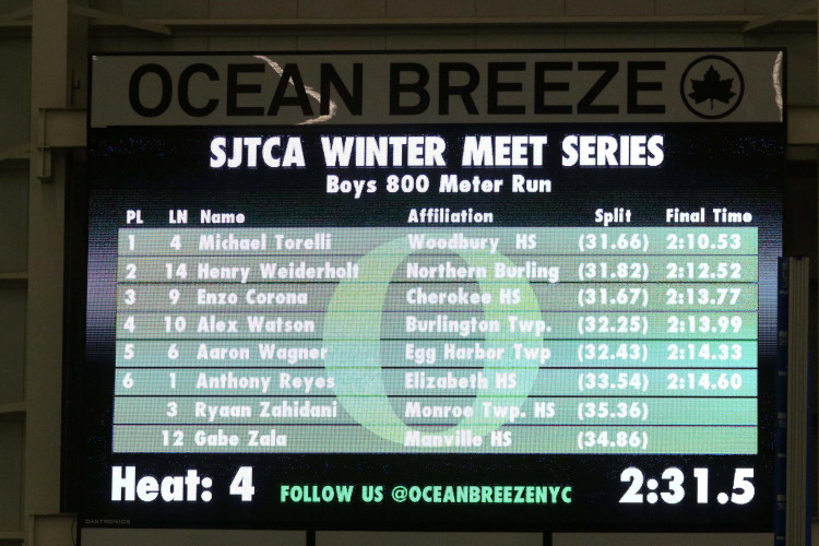 "There were four heats of the 1600 and Matteo Evola and Anthony DiBatista were both in Heat 3. Matteo struggled a little over the final 400 but otherwise had a decent run while Anthony finished well to record a new personal record for the event! Andrew Free was in the seeded (4th) heat and he, once again, raced well to improve on his time from Ocean Breeze last week! Andrew finished 6th in the Olympic Conference and came within a second of his outdoor PR!