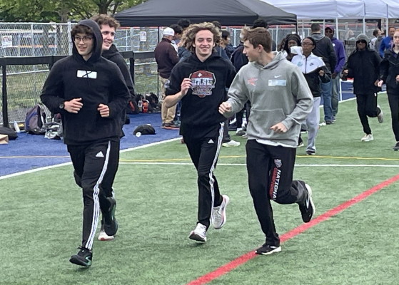"Patrick Ditmars and Conor Jacob had the toughest jobs as they were tripling in the 400, 800 and 4 x 400! Patrick won the 400 in a fast 50.8 and, although he ran well, Conor narrowly missed picking up a 3rd! Coming back a few minutes later in the 800, where they were joined by Bobby Poplau, Conor took the win and Patrick was 3rd with Bobby, running his first 800 since last spring, picking up the 2nd place points!