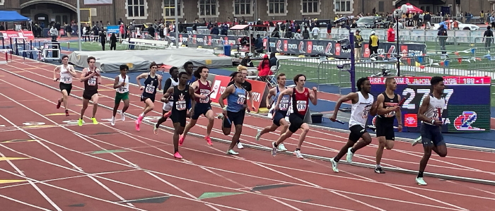 No 4 X 400m Relay team can run at Penn without getting out fast and then, on the first exchange where as many as 16 teams are close, power into the zone and firmly exchange the baton to your next runner! Usually, by the next exchange, the group has spread out and, from then on, it's mostly quick transfers of the baton and running as fast as you can to the finish! Run fast, turn left! Easy peasy!