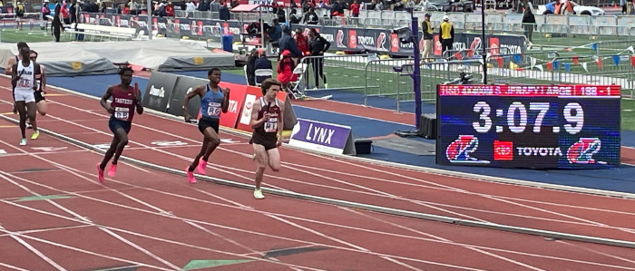 A quick review of the results shows some nice running in the distance events, the Freshman and Novice 1600m Runs! In the Freshman race, Logan Bromley took 2nd place with a time only 3 seconds over his 1600m PR, and "met" a kid from Moorestown whom he will be competing against for the next three years! Nice to take note of Logan's last quarter in 65 seconds! In the Novice race of 52 competitors, 10th grader Enzo Corona took 1st place in a barnburner of a race, setting a new PR by 15 seconds and beating his 12th grade opponent from Washington Twp by only 0.20: 4:39.73 to 4:39.93! In the same race, Sophomores Ben Weiner set a PR and took 5th; Tate Midora set a PR and took 8th; Anthony DiBatista, who was 3 seconds over his Indoor PR, took 9th; Silas Matteson finished 13th overall but was 1st in his heat and set a new PR; and Sam Wright was well back in the pack but raced a new PR!