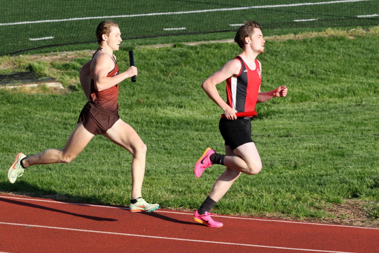 "The Varsity 4 X 400 team, comprised of distance runners - Conor, Nick, Bobby and Patrick - ran well to pick up the win and make it a full 28 points scored by the distance team on the day! Unfortunately, it was not quite enough to overcome RV's depth and the team suffered its first loss, 77-64! In the JV 4 X 400's, new PR's were set by Logan Bromley, Myron Paes, Luke Reistle and Tate Midora!"